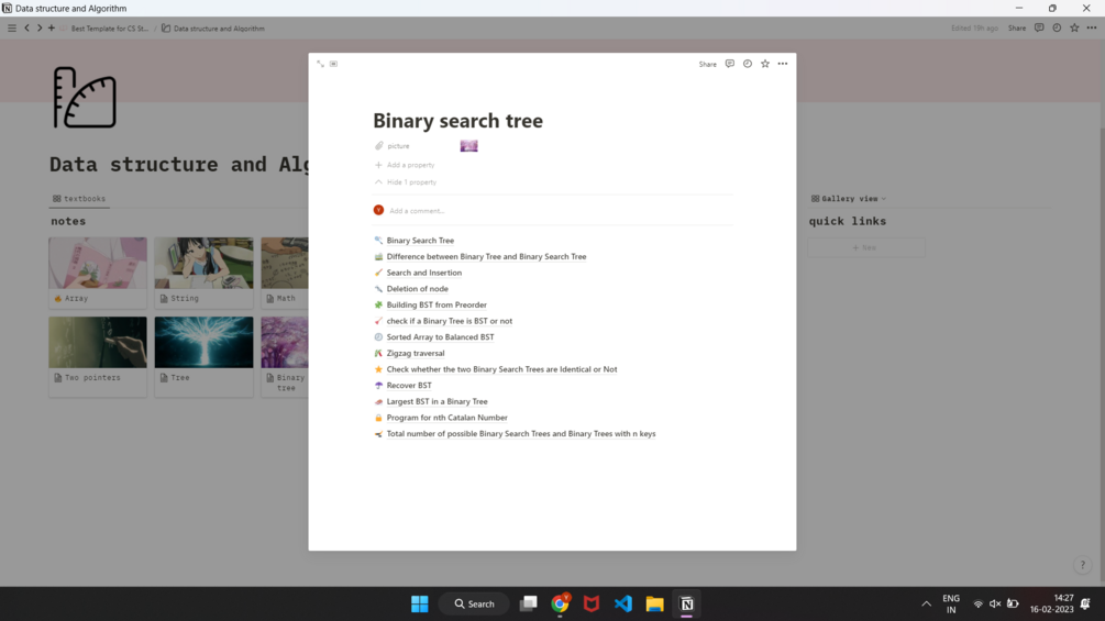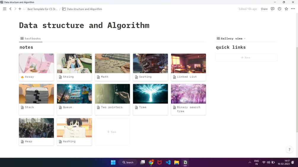 Notion Template for Data Structure & Algorithm Notes is a comprehensive template to help you track and organize your data structure and algorithm related studies. This template includes sections for each of the major data structures and algorithms, such as Arrays, Linked Lists, Trees, Graphs, Sorting, Searching, and many more. It also includes sections for taking notes, practice problems, and resources. With this template, you can easily create an organized and comprehensive study plan to help you master data structure and algorithm concepts.